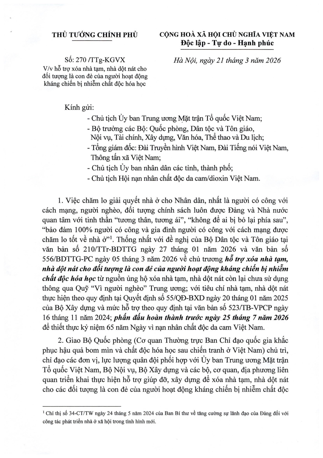 Công văn số: 270/TTg-KGVX của Thủ tướng Chính phủ về việc hỗ trợ xóa nhà tạm, nhà dột nát cho đối tượng là con đẻ của người hoạt động kháng chiến bị nhiễm chất độc hóa học