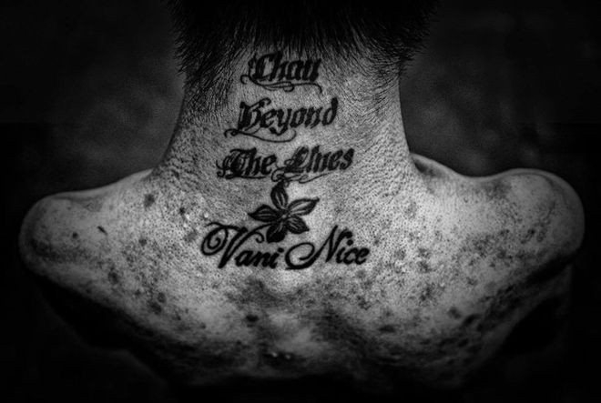 During my volunteer trip with Chau in Binh Thuan, I shared a room with Chau. And the photo taken from a moderately high angle showed a thorny and fierce Chau from behind. The words \"Chau beyond the lines\" that he tattooed on the back of his neck is the name of the film directed by Courtney Marsh (USA), which was nominated for Oscar Award some years ago. Perhaps it is difficult to think of a better title than that.