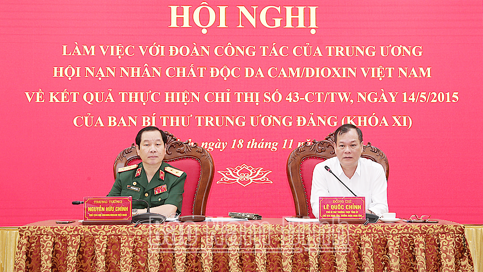 Phát biểu tại buổi làm việc, đồng chí Phó Bí thư Thường trực Tỉnh ủy Lê Quốc Chỉnh yêu cầu các cấp, các ngành trong tỉnh cần tập trung vào một số nhiệm vụ trọng tâm: Xác định công tác khắc phục hậu quả chất độc hóa học là trách nhiệm của mỗi cấp ủy Đảng, chính quyền, MTTQ và các đoàn thể chính trị - xã hội và của mỗi cán bộ, đảng viên trong toàn tỉnh. Tiếp tục đẩy mạnh công tác tuyên truyền chủ trương, đường lối của Đảng, chính sách, pháp luật của Nhà nước liên quan đến giải quyết hậu quả chất độc hóa học trong chiến tranh, trong đó quán triệt sâu sắc Chỉ thị số 43, các nghị quyết, chỉ thị có liên quan nhằm giải quyết chính sách đối với người có công với cách mạng và người khuyết tật trong tỉnh trong tình hình mới. Chú trọng nêu gương những gia đình nạn nhân vượt lên khó khăn bệnh tật hòa nhập cộng đồng để lan tỏa tạo động lực cho các nạn nhân, các gia đình nạn nhân khác cùng vươn lên. Các cơ quan chức năng các cấp tiếp tục rà soát, thẩm định hồ sơ, bảo đảm quyền lợi của người tham gia kháng chiến bị nhiễm chất độc hóa học khi có đủ điều kiện nhưng chưa được hưởng chế độ chính sách theo quy định. Kịp thời cụ thể hóa các chủ trương của Đảng, quy định của Nhà nước liên quan đến chế độ chính sách đối với các nạn nhân phù hợp với tình hình thực tế của tỉnh. Tiếp tục chỉ đạo xây dựng, củng cố các trung tâm bảo trợ xã hội trên địa bàn tỉnh để tiếp nhận, chăm sóc các NNCĐDC có hoàn cảnh khó khăn; đẩy mạnh phong trào hành động vì NNCĐDC, qua đó tăng cường vận động các nguồn lực để nâng cao hiệu quả, hỗ trợ, chăm sóc, giúp đỡ NNCĐDC. Hội NNCĐDC/dioxin các cấp trong tỉnh tiếp tục nâng cao chất lượng hoạt động; chủ động rà soát, nắm bắt diễn biến di chứng da cam các thế hệ 3 và 4 để tích cực tham mưu quan tâm chỉ đạo giải quyết tốt công tác chăm sóc, giúp đỡ NNCĐDC. MTTQ, các đoàn thể chính trị xã hội giao nhiệm vụ các tổ chức xã hội phối hợp với các NNCĐDC để chăm lo, giúp đỡ và thực hiện các chế độ chính sách đối với NNCĐDC.