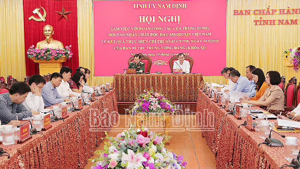 Phát biểu tại buổi làm việc, đồng chí Chủ tịch Trung ương Hội NNCĐDC/dioxin Việt Nam Nguyễn Hữu Chính đánh giá cao việc triển khai Chỉ thị số 43-CT/TW của Ban Bí thư Trung ương Đảng của tỉnh Nam Định; đồng thời, đề nghị tỉnh tiếp tục thực hiện hiệu quả Chỉ thị, trong đó kịp thời phát hiện các đối tượng nhiễm chất độc hóa học để có hướng dẫn hỗ trợ nhận các chính sách ưu đãi của Đảng và Nhà nước; có ý kiến bổ sung những khó khăn, bất cập trong quá trình triển khai các văn bản của Trung ương liên quan đến hỗ trợ NNCĐDC; cần tạo điều kiện sinh kế cho các nạn nhân, quan tâm hơn nữa đến hoạt động của tổ chức Hội NNCĐDC/dioxin trên địa bàn tỉnh, góp phần xây dựng tổ chức Hội vững mạnh.