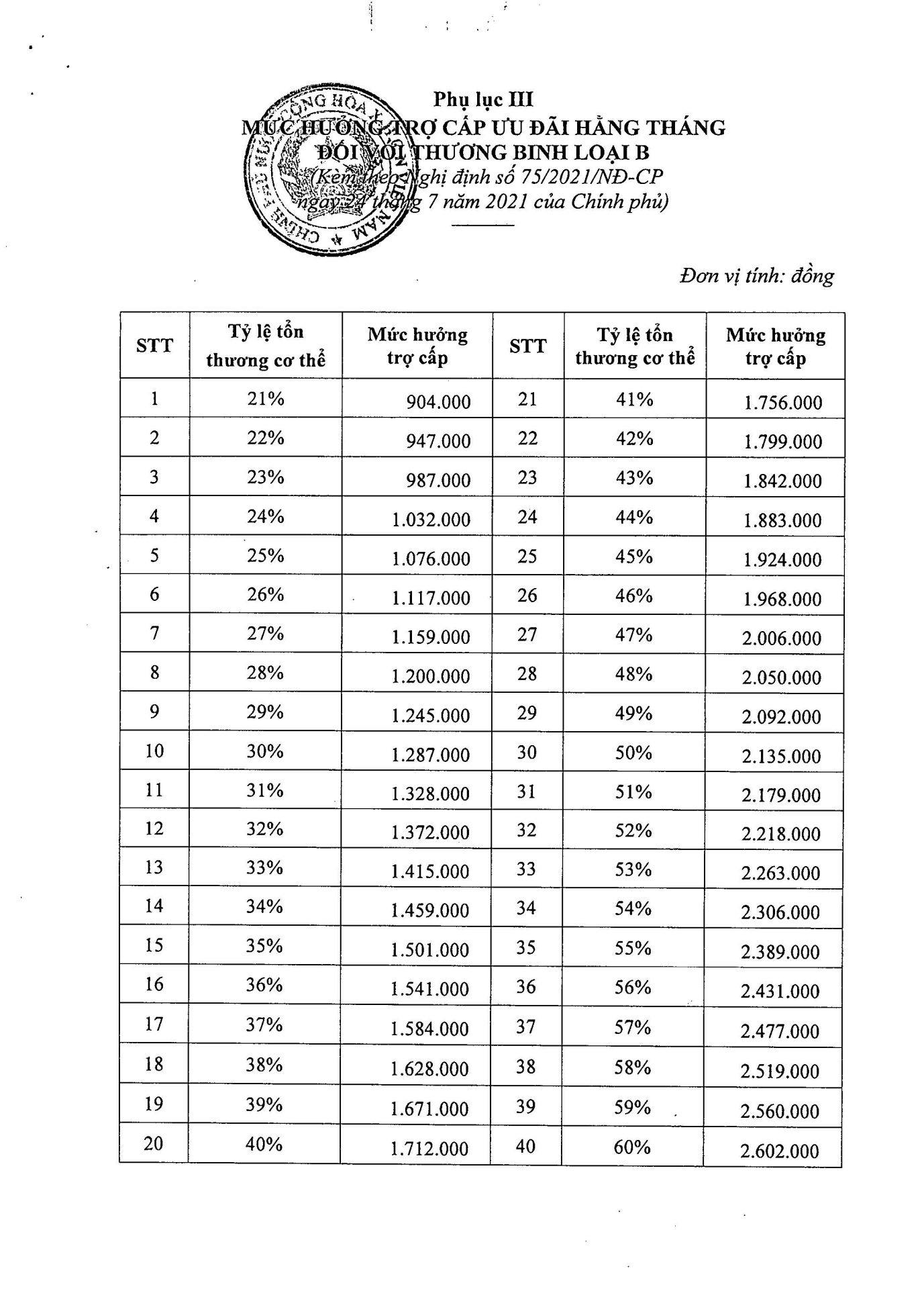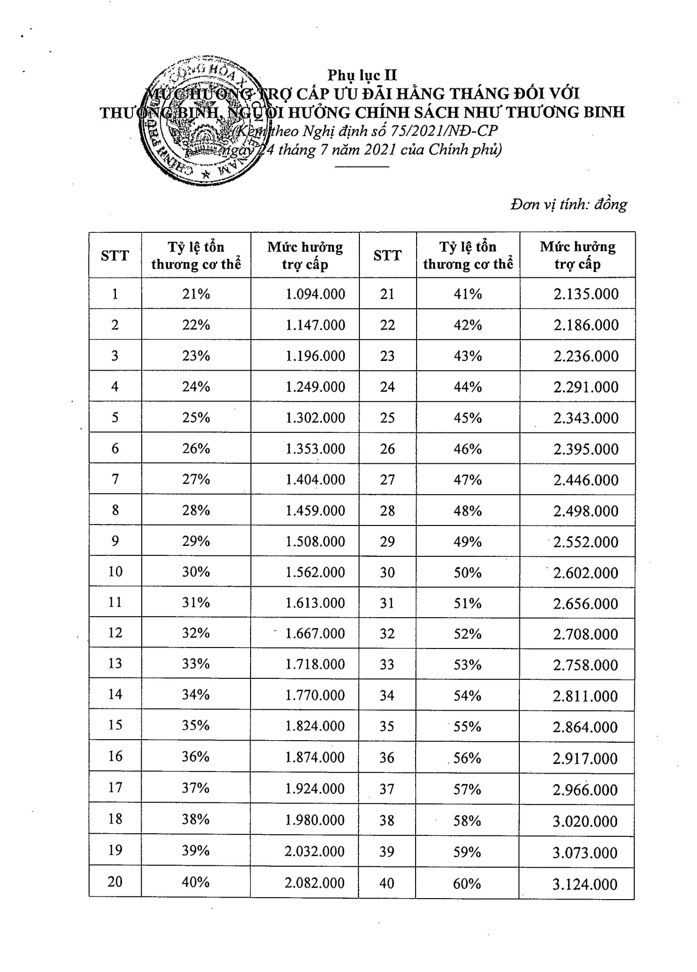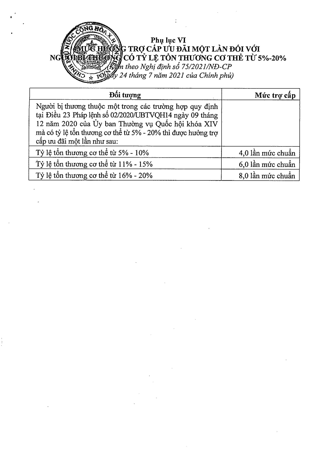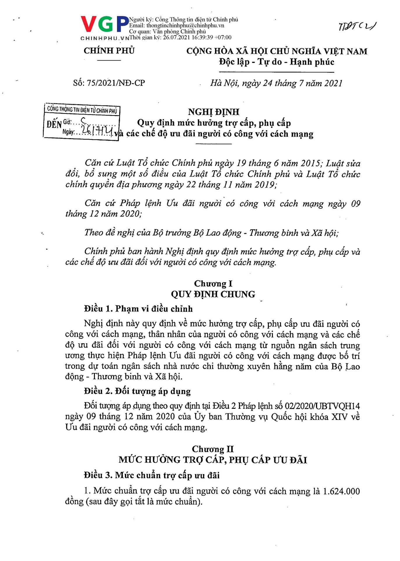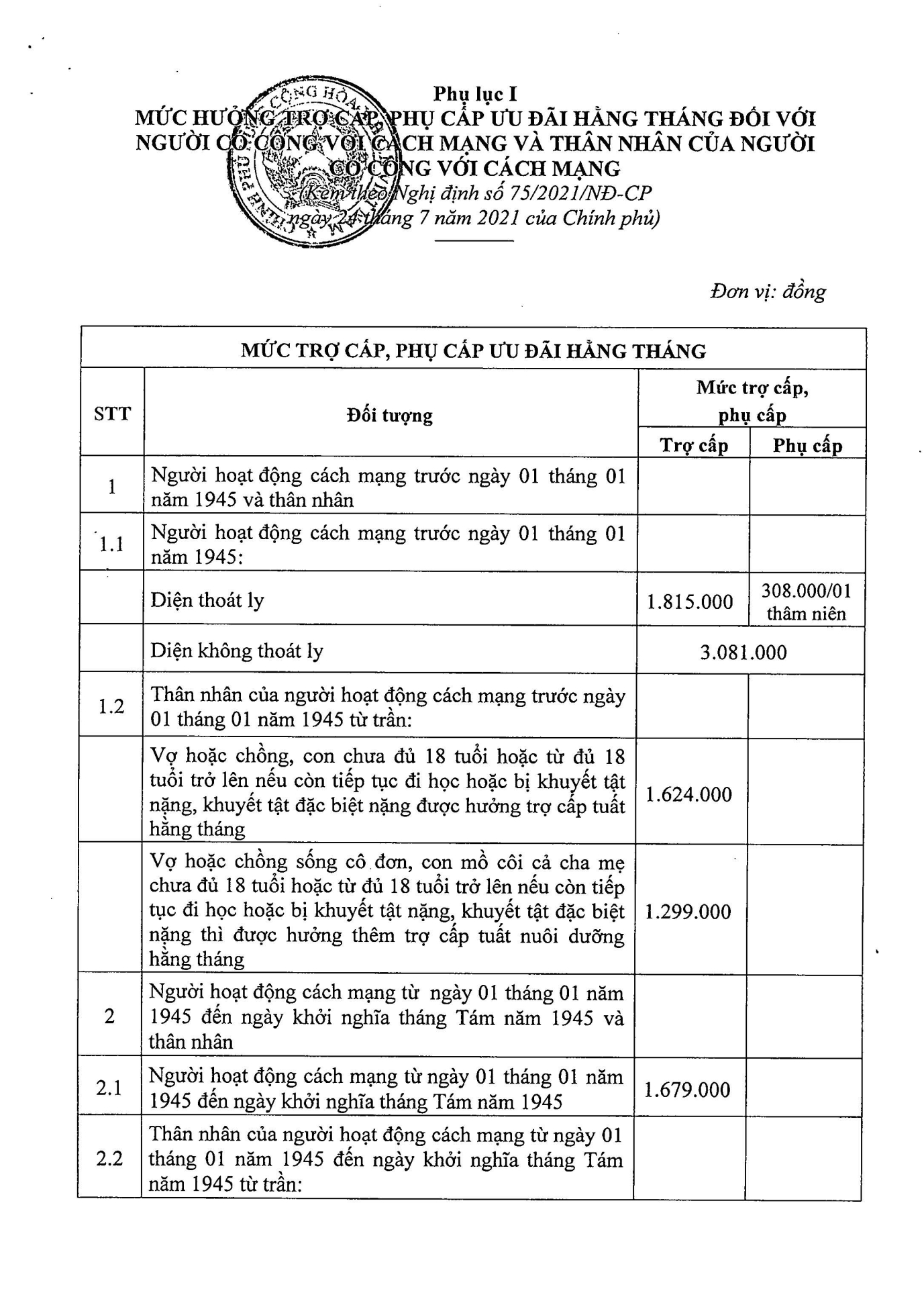 Nghị định số 75/2021/NĐ-CP của Chính phủ: Quy định mức hưởng trợ cấp, phụ cấp và các chế độ ưu đãi người có công với cách mạng 11:27 - 01/06/2024 Tải xuống nghi-dinh-75.pdfChia sẻ: