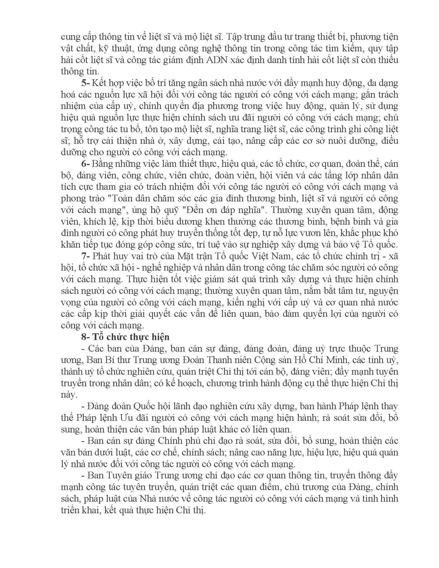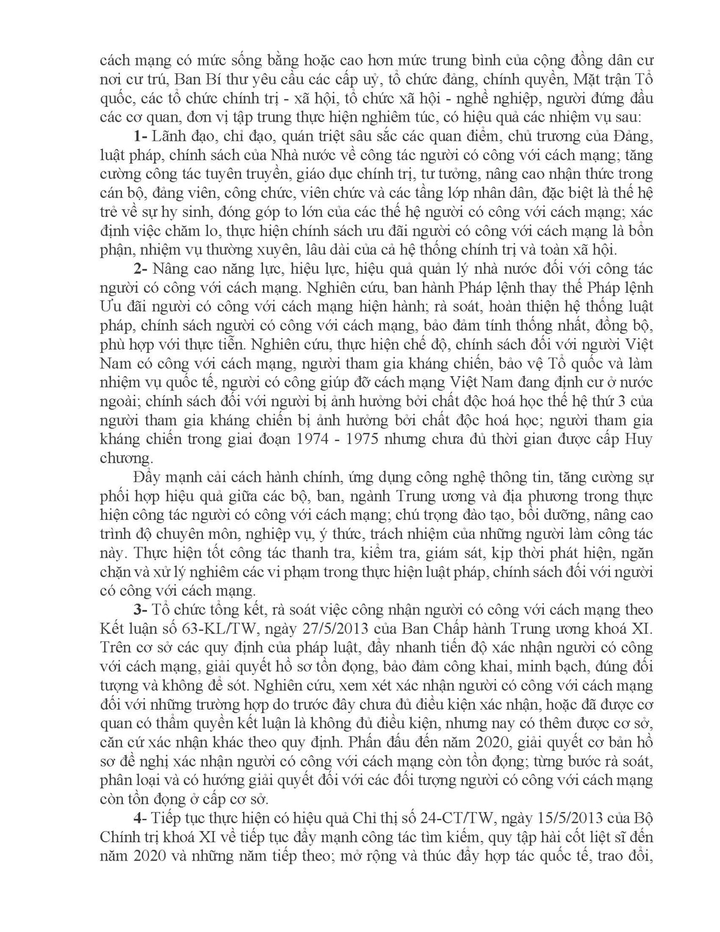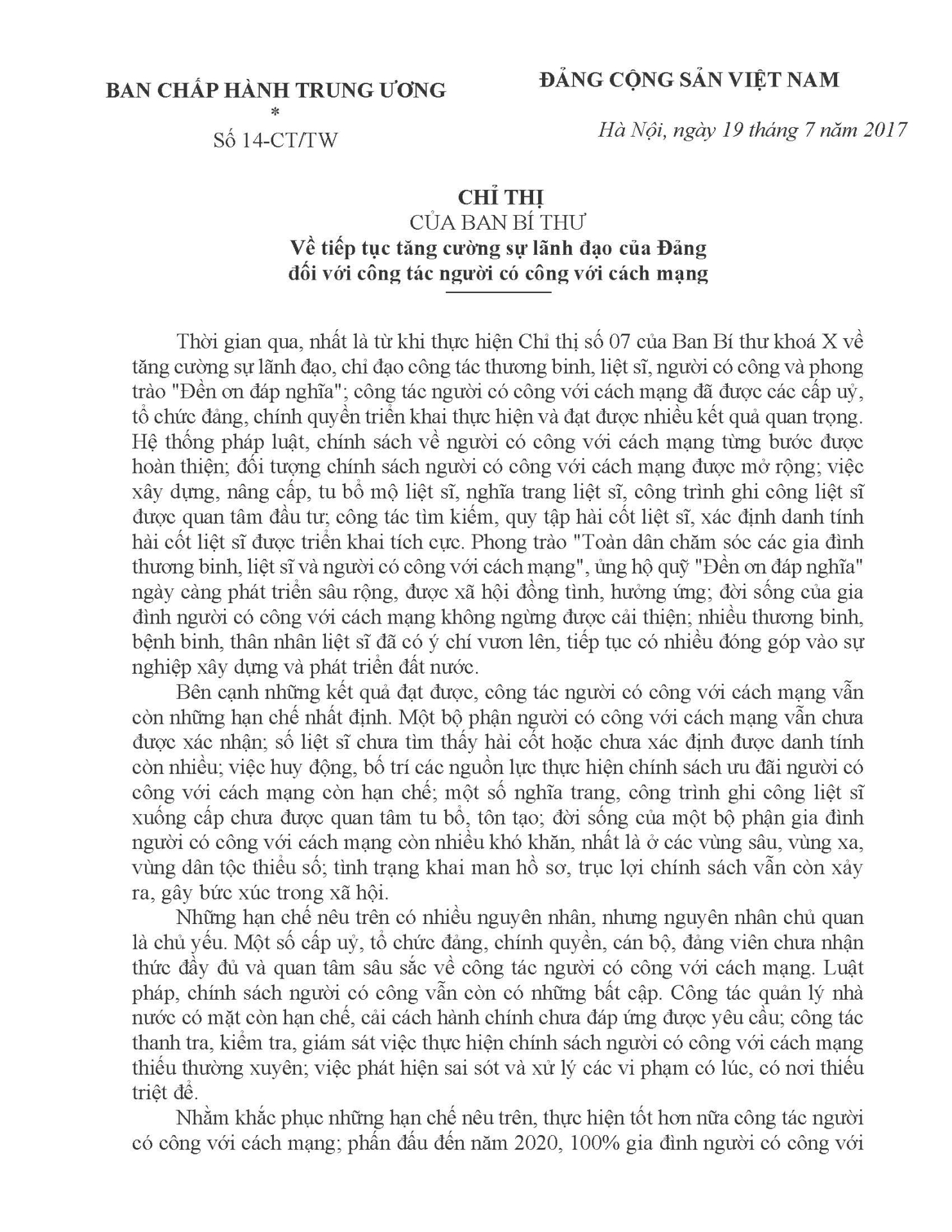 Chỉ thị số 14-CT/TW ngày 19/7/2017 của Ban Bí thư về tiếp tục tăng cường sự lãnh đạo của Đảng đối với công tác người có công với cách mạng 19:56 - 01/06/2024 Chia sẻ: