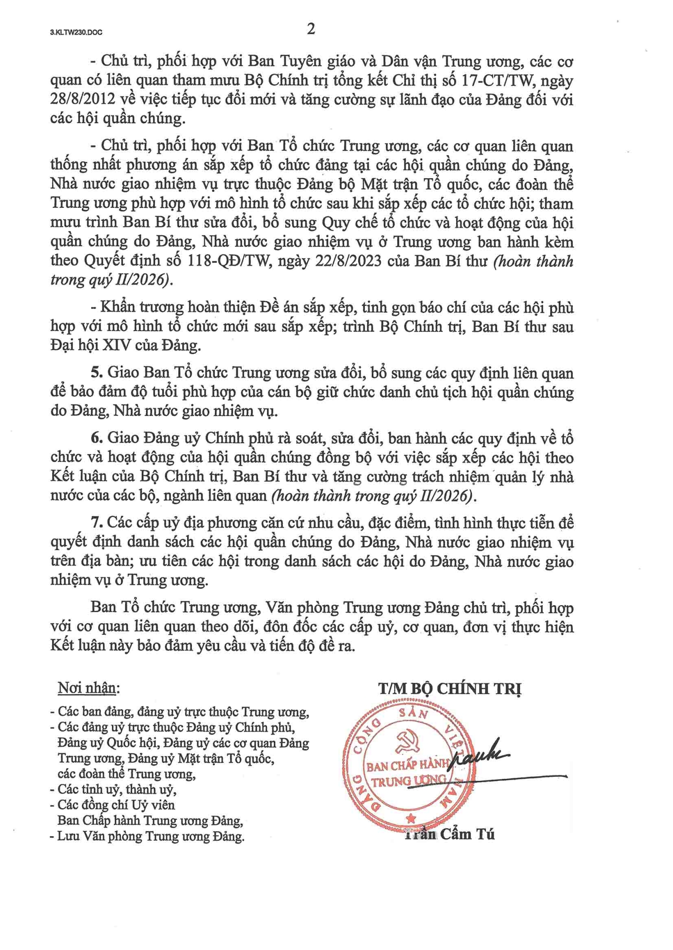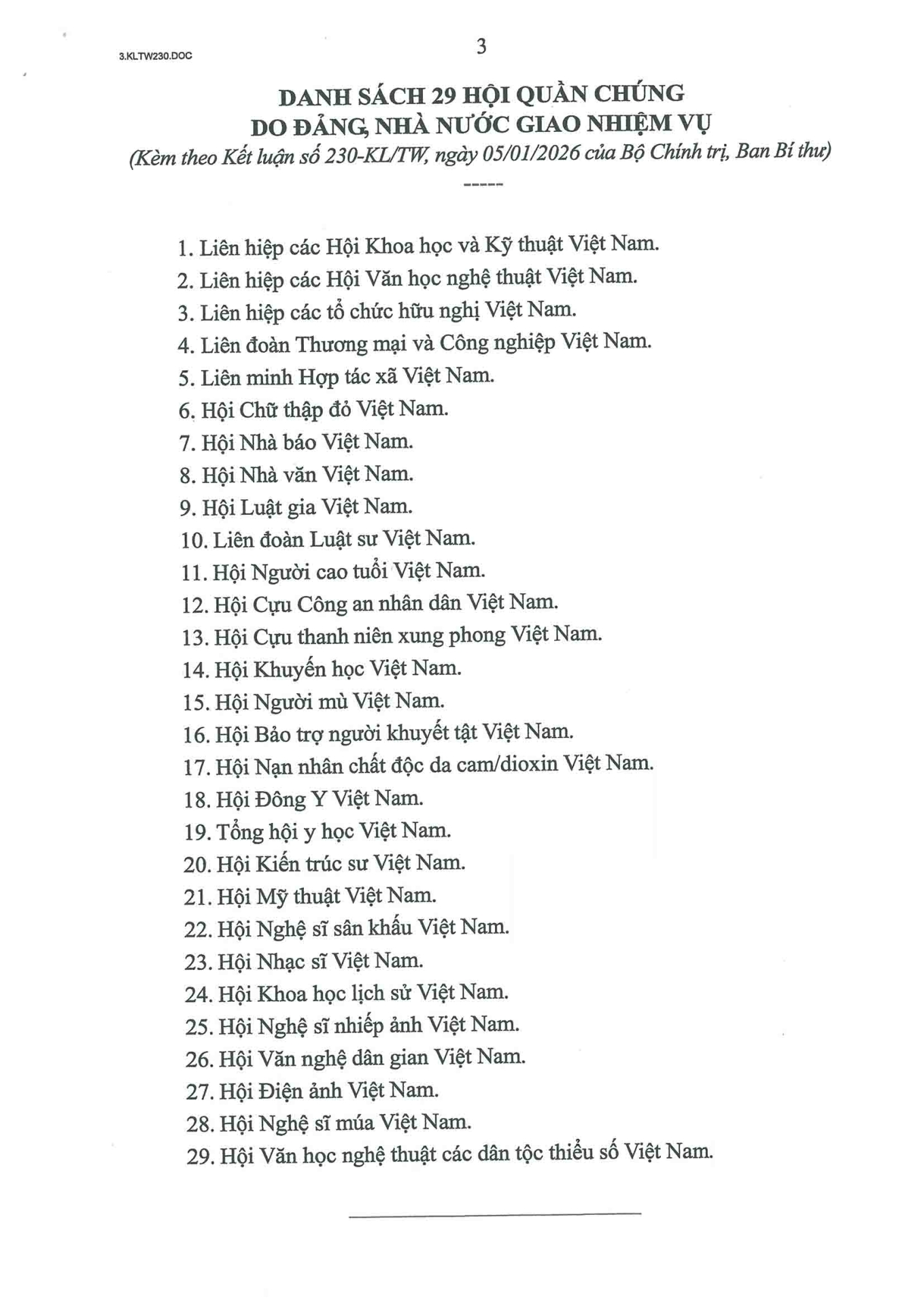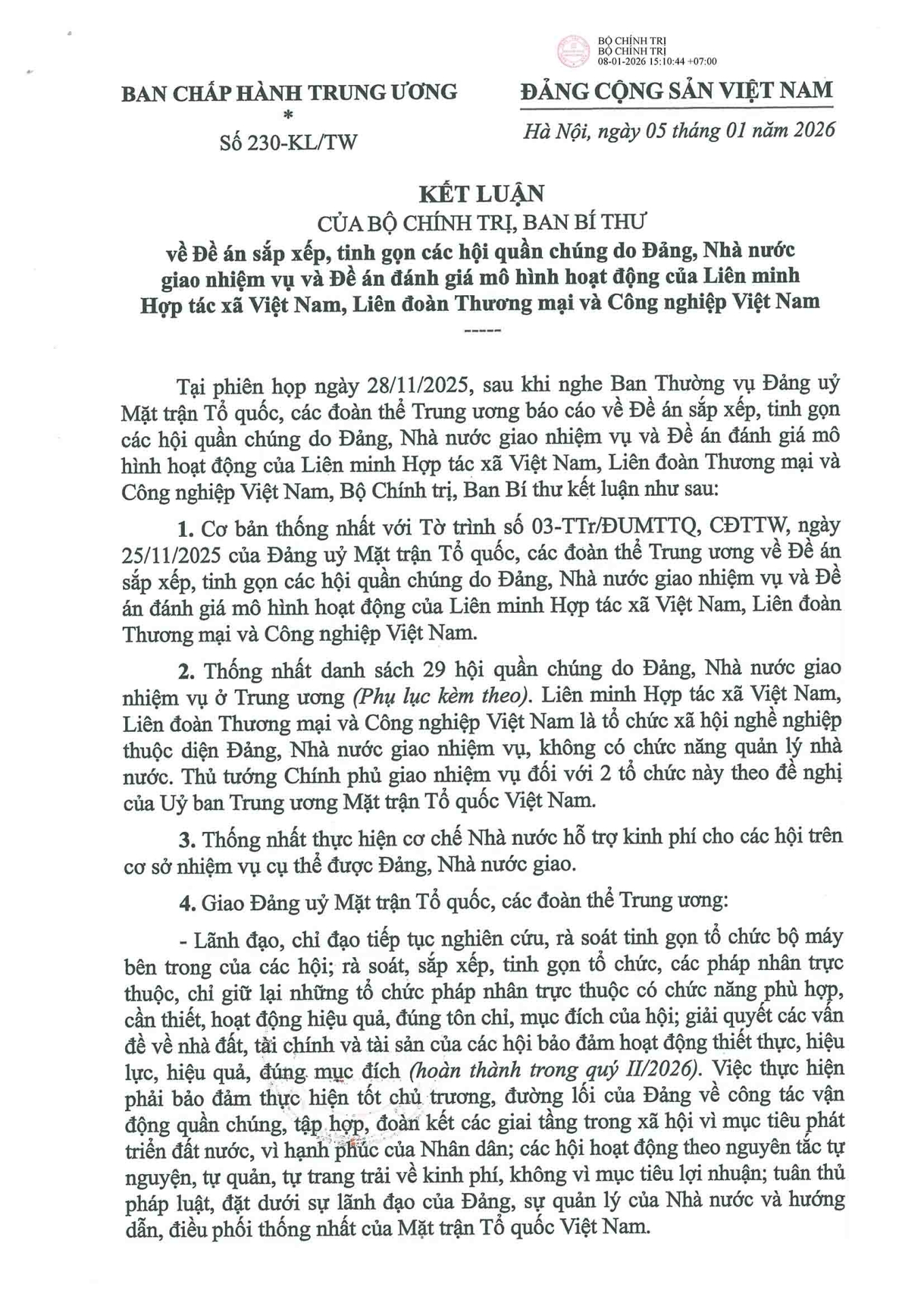 Kết luận số 230-KL/TW của Bộ Chính trị, Ban Bí thư về Đề án sắp xếp, tinh gọn các hội quần chúng do Đảng, Nhà nước giao nhiệm vụ 09:39 - 18/01/2026Tải file PDF tại đây Chia sẻ: